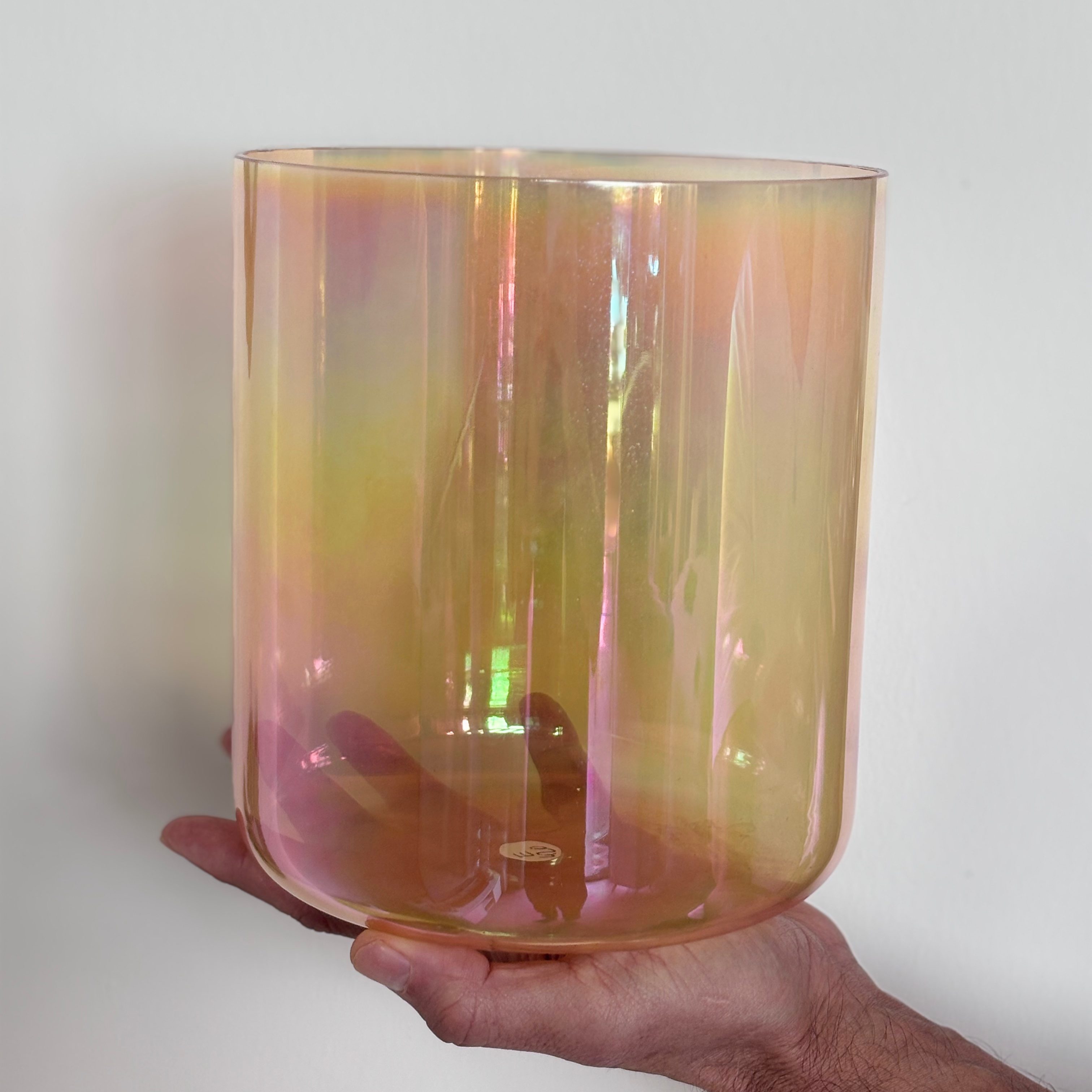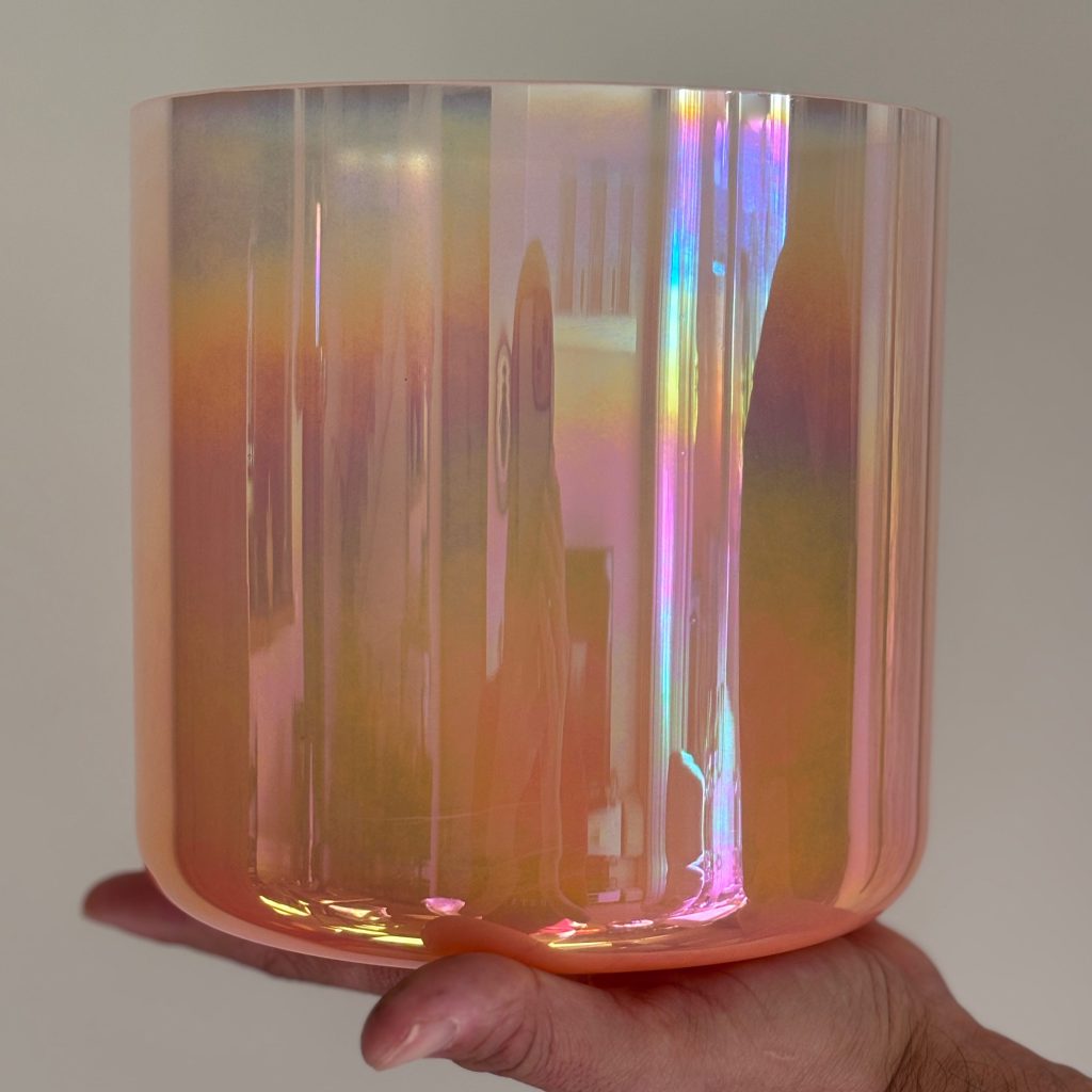Aurea D is an iridescent crystal singing bowl tuned to the note D, resonating with clarity, inner vision, and gentle grounding. Its soft green-gold hues catch the light like a veil, revealing delicate rainbow reflections that shift without distraction.