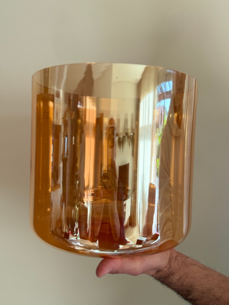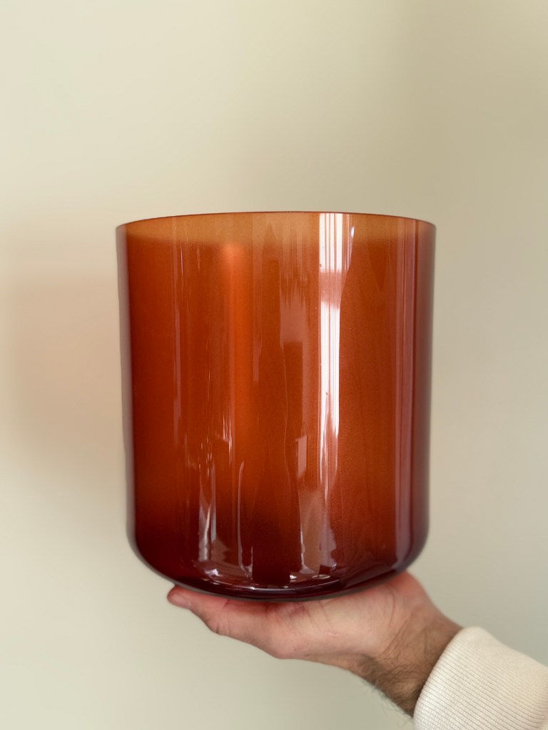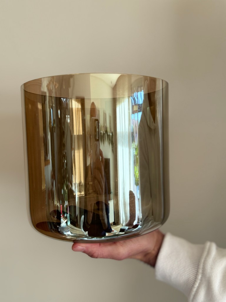 This F note crystal singing bowl, finished in a luminous smoky quartz hue, carries a deep, grounding resonance that soothes the heart and steadies the body. Its warm, reflective surface mirrors stillness and presence, while the rich tone supports emotional balance, grounding, and gentle release. Ideal for healing past traumas and heart wounds.