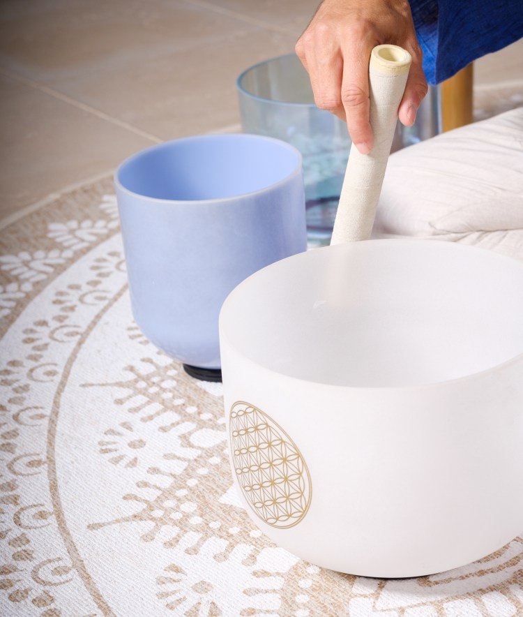In my sound healing sessions, I mainly use crystal bowls. They are modelled after the Tibetan singing bowls and made of pure crystal quartz and some are fused with precious minerals and metals. The tones they carry are very powerful. When the bowls are played, they produce sound waves frequency that are consciousness altering equivalent to alpha waves, which are associated to a state of deep relaxation and dreaming.